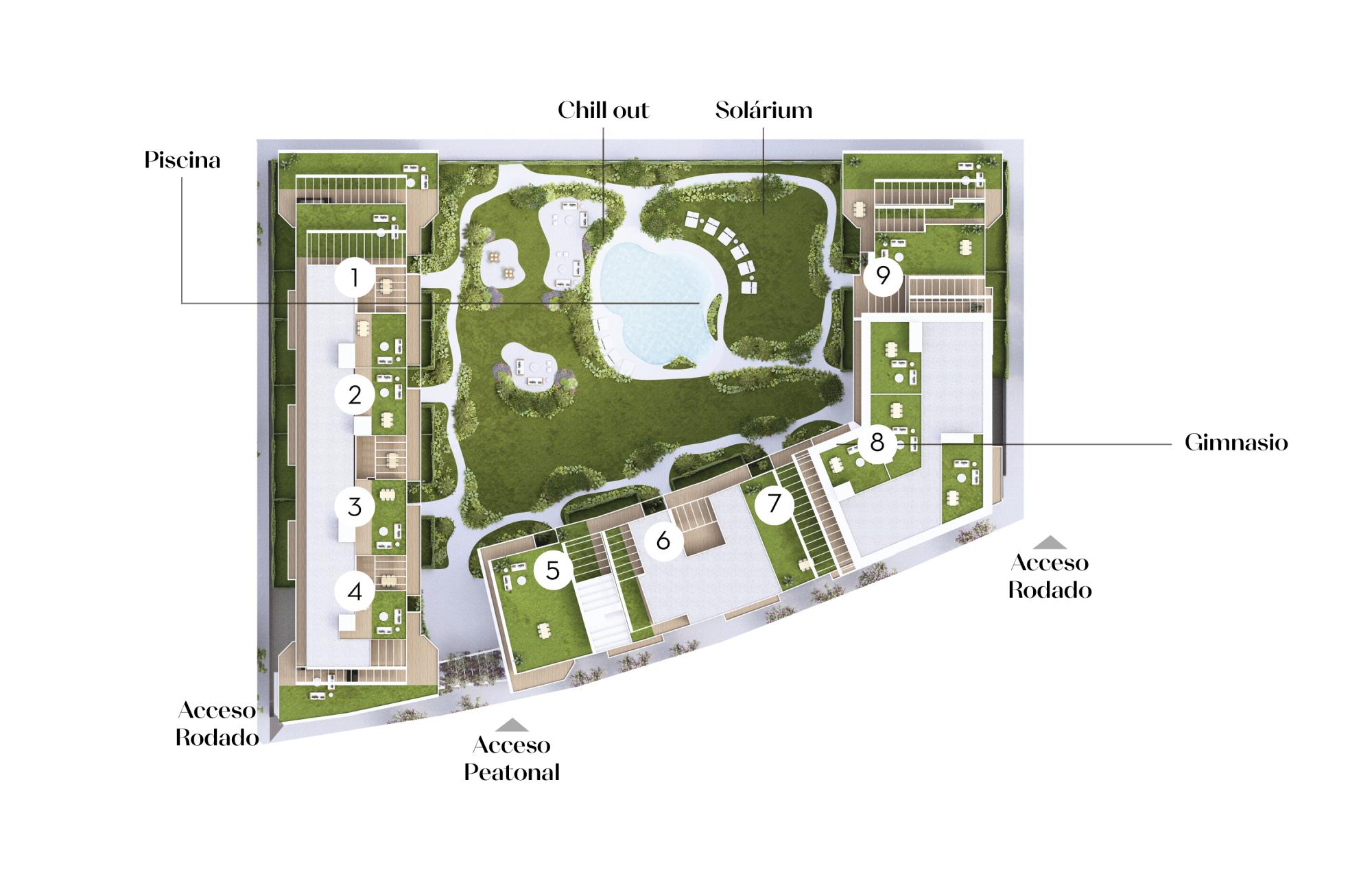 Las zonas comunes crean un espacio para disfrutar y desconectar. Instalaciones diseñadas para el bienestar de los/las residentes, integradas en el oasis urbano que rodea la promoción. La piscina con solárium, el chill out y el gimnasio brindan momentos de descanso y conexión con la naturaleza.